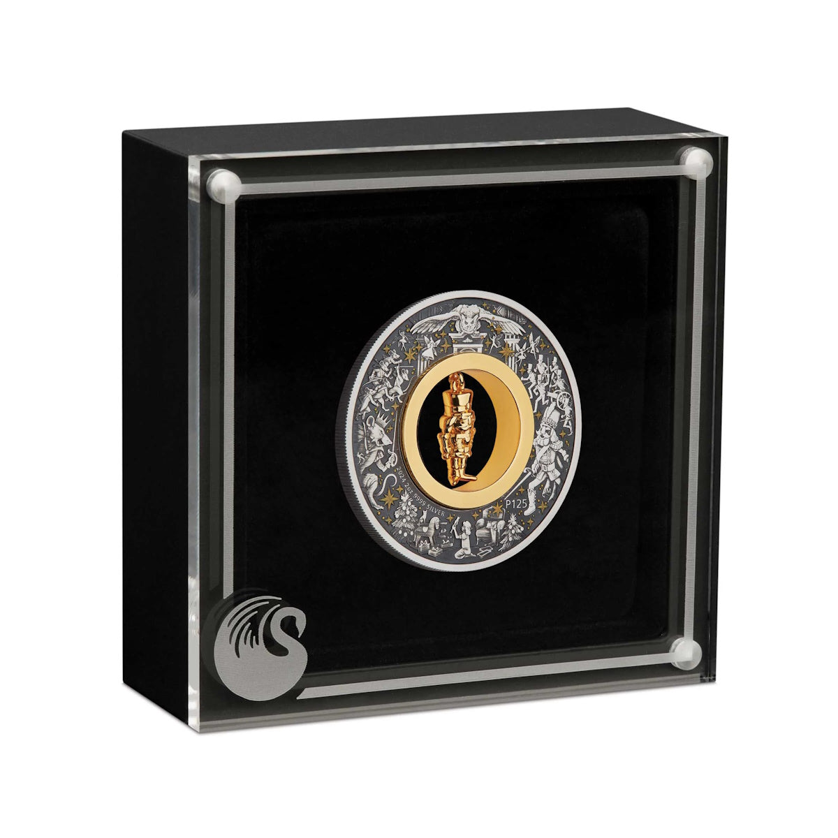 Featuring an antiqued finish, the coin portrays leading characters from the storyline, including the Nutcracker, his foe the Mouse King, and a young girl among Christmas gifts. Also included are fairies, Christmas trees, an owl, golden-coloured stars, and a ‘P125’ mintmark signifying The Perth Mint’s 125th anniversary.